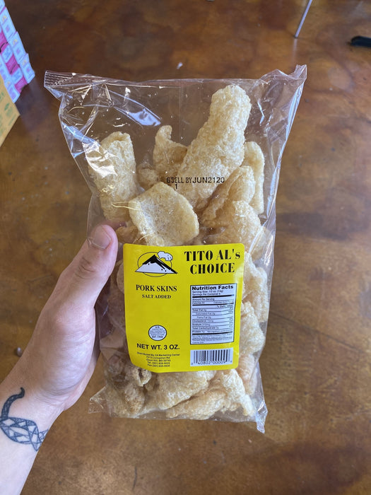 Click to expand Tap to zoom Tito Al Pork Rind - Salted, 3oz Save Liquid error (snippets/product-badge line 32): Computation results in '-Infinity'% $3.49 1 2 3 4 5 6 7 8 9 10+ Quantity Quantity Add Item Tito Al Pork Rind - Salted, 3oz